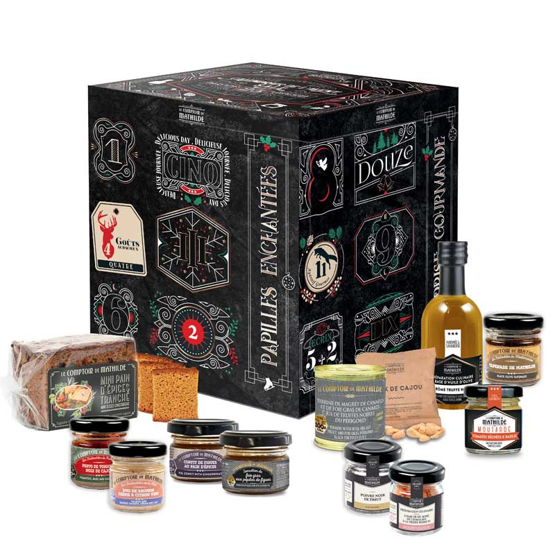 Ingrédients : Moutarde aux herbes de Provence: MOUTARDE (eau, graines de MOUTARDE 26%, vinaigre d’alcool, sel, acidifiant: acide citrique, conservateur: SULFITES), herbes de Provence 1,4% (romarin, basilic, marjolaine, thym, sarriette en proportions variables), arôme naturel. Moutarde aux tomates séchées et basilic: MOUTARDE (eau, graines de MOUTARDE 26%, vinaigre d’alcool, sel, acidifiant: acide citrique, conservateur: SULFITES), tomates séchées 5,4%, basilic 3,6%, poudre de tomate. Moutarde à l’ancienne et piment d’Espelette: MOUTARDE à l’ancienne (eau, graines de MOUTARDE, vinaigre, sel), poudre de piment d’Espelette 2,5%. Moutarde ail et basilic: MOUTARDE (eau, graines de MOUTARDE 26%, vinaigre d’alcool, sel, acidifiant: acide citrique, conservateur: SULFITES), ail 5,5%, basilic 1,5%. Moutarde à la truffe noire aromatisée 1%: MOUTARDE (eau, graines de MOUTARDE 26%, vinaigre d’alcool, sel, acidifiant: acide citrique, conservateur: SULFITES), brisures de truffes noires 1,12% (truffes noires (Tuber melanosporum), jus de truffes noires, eau, sel), arôme truffe. Moutarde au vin blanc et au vinaigre de vin: Eau, graines de MOUTARDE, vin blanc* 14%, vinaigre de vin* 8%, sel, sucre, conservateur : SULFITE acide de sodium, épices, antioxydant : acide citrique, épaississant : gomme xanthane. *SULFITES. Préparation à base de saumon et saumon fumé, de crème et de citron vert: SAUMON et SAUMON fumé 50%, CREME fraiche 37,5%,MOUTARDE (eau, graines de MOUTARDE, vinaigre d’alcool, sel), ciboulette, fibres végétales (blé, lin, agrumes), sucre, zeste de lime 1%, jus de citron vert concentré 0,8%, sel de Guérande, épices, aromates. Tapenade noire: Olives noires 75% (olives, eau, sel), huile d’olive vierge extra, câpres 5% (câpres, eau, vinaigre, sel), pâte d’ANCHOIS 4% (ANCHOIS, sel), ail, jus de citron concentré, aromates. Préparation à base de tomates, basilic et noix de cajou: Tomates concassées 20% (tomate, jus de tomates, acidifiant : acide citrique), huile de colza, concentré de tomates 17%, poivron rouge, basilic 9%, FROMAGES italiens, eau, carottes, NOIX DE CAJOU 3,5%, ail, sel, épices et aromates, sucre, arôme naturel. Préparation à base de pomme de terre et de truffe brumale 1,1%: Eau, CREME fraîche, pomme de terre 22,9%, flocon de pomme de terre 7,1%, huile d’olive, sel de Guérande, truffe Brumale 1,1 %, épices et plantes aromatiques, arôme truffe, extrait d’ail, extrait de carotte. Mélange apéritif à réhydrater “Thailandaise”: Ail, oignon, LACTOSE, curry, curcuma, poivre blanc, bouillon de légumes, piment, sel, acide citrique. Mélange apéritif à réhydrater “Bombay”: Mangue, ananas, curry, gingembre, sel, ail, piment. Mélange apéritif à réhydrater “Toscane”: FROMAGE, basilic, ail, oignon, NOISETTE, sel, pignon de pin, origan, poivre blanc, épaississant : gomme de guar. Mélange apéritif à réhydrater “Méditerranéen”: Tomate, ail, basilic, bouillon de légumes, origan. Mélange apéritif à réhydrater “Marrakech”: Curry (coriandre, curcuma, fenouil, sel, piment, cumin, fenugrec, carvi), sel de mer, persil, oignon, farine de MOUTARDE. Préparation culinaire à base de sel rose de l’Himalaya, truffe noire 1% et poivre noir: Sel rose de l’Himalaya 98,08% (diamant de sel), brisures de truffes noires 1,12% (truffes noires (Tuber melanosporum), jus de truffes noires, eau, sel), poivre noir 0,8%. Poivre Noir de Timut: Poivre de Timut. Préparation à base de figue et de pain d’épices: Figues violettes 50%, sucre, eau, pain d’épices 10%, (miel 38%, farine de SEIGLE, sirop de glucose-fructose, eau, poudres à lever : E450, E500, épices, son de SEIGLE, son de BLE, amidon de BLE), jus de citron concentré. Pain d’épices au miel: Sirop de glucose-fructose, farine de SEIGLE, miel 11%, poudre à lever: carbonate acide de sodium, huile de colza, sel, épices, plantes aromatisantes. Préparation de foie de canard à la figue : Foie gras de canard 20%, foie de volaille, graisse de canard, figues 4%, OEUFS, LAIT, fond de blanc de volaille (maltodextrine, fécule de pomme de terre, arômes naturels, sel, graisse de poule, viande de poulet, plantes aromatiques, poireau), sel, poivre, sucre, épices. Préparation culinaire à base d’huiles et arôme truffe noire : Huile de colza 78,32%, huile d’olive vierge extra 19,58%, arôme naturel. Noix de cajou à la fleur de sel et au romarin : NOIX DE CAJOU, fleur de sel de Camargue 2,3%, romarin récolté en Provence 1,4%, fibre d’acacia. Biscuit au parmesan : Farine de BLÉ, BEURRE, PARMESAN, EMMENTAL, sucre, vin blanc (SULFITES), levure chimique, sel, poivre. Biscuit aux olives noires : Farine de BLÉ, olives noires, huile de tournesol, vin blanc (SULFITES), sucre, levure chimique, thym, Fleur de sel, ail, sel, poivre.