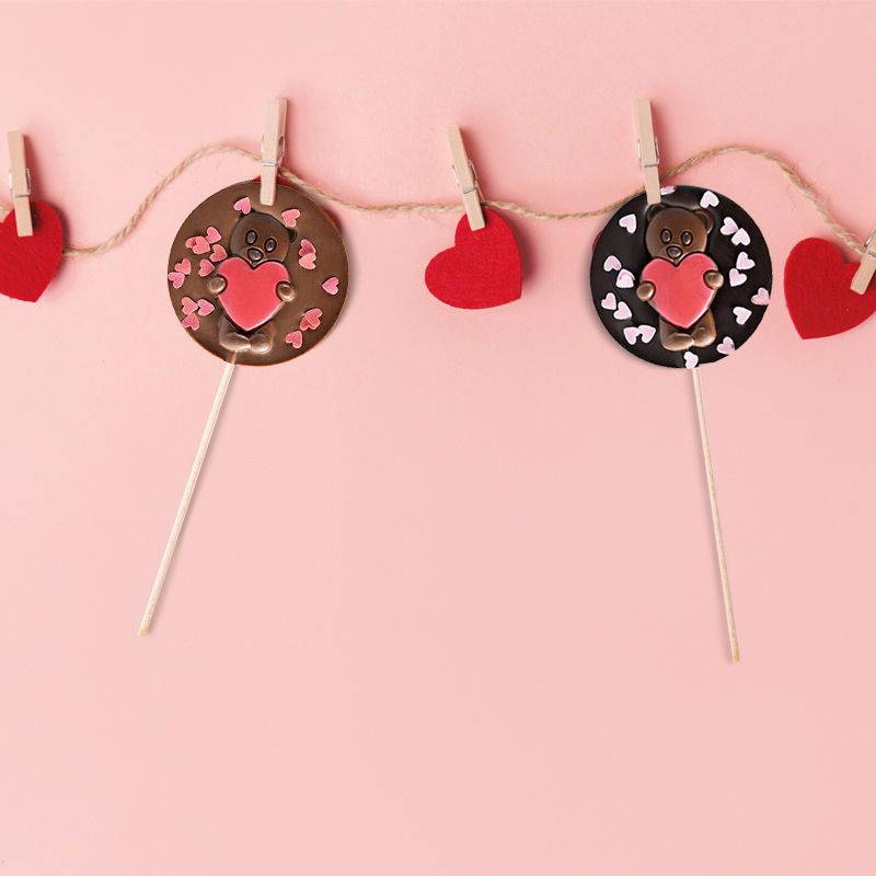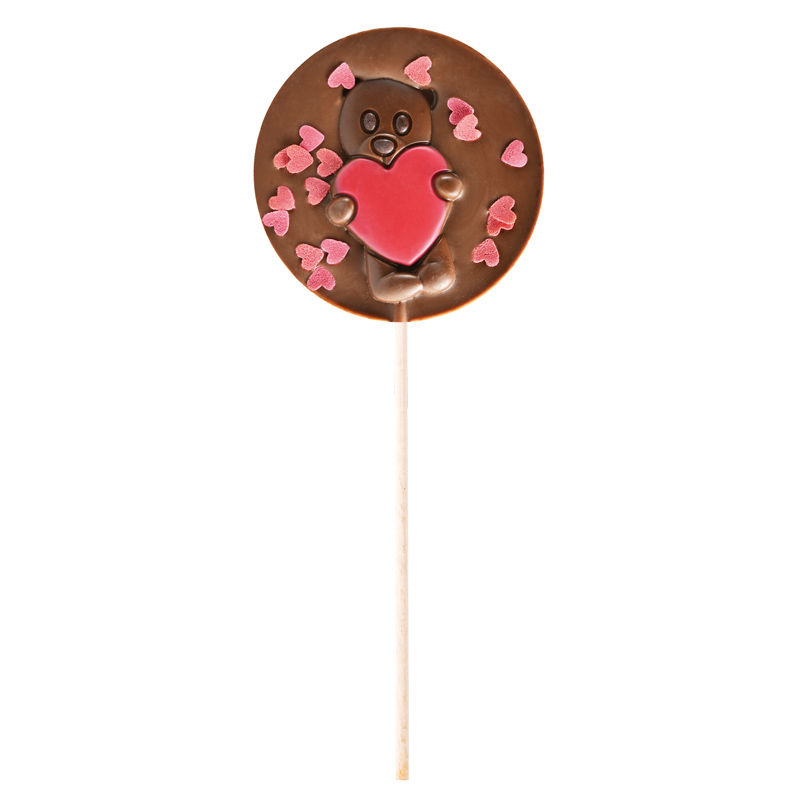 Déclarez votre amour avec gourmandise grâce à notre sucette en chocolat au lait avec un sujet ourson et ses petits cœurs en sucre.
