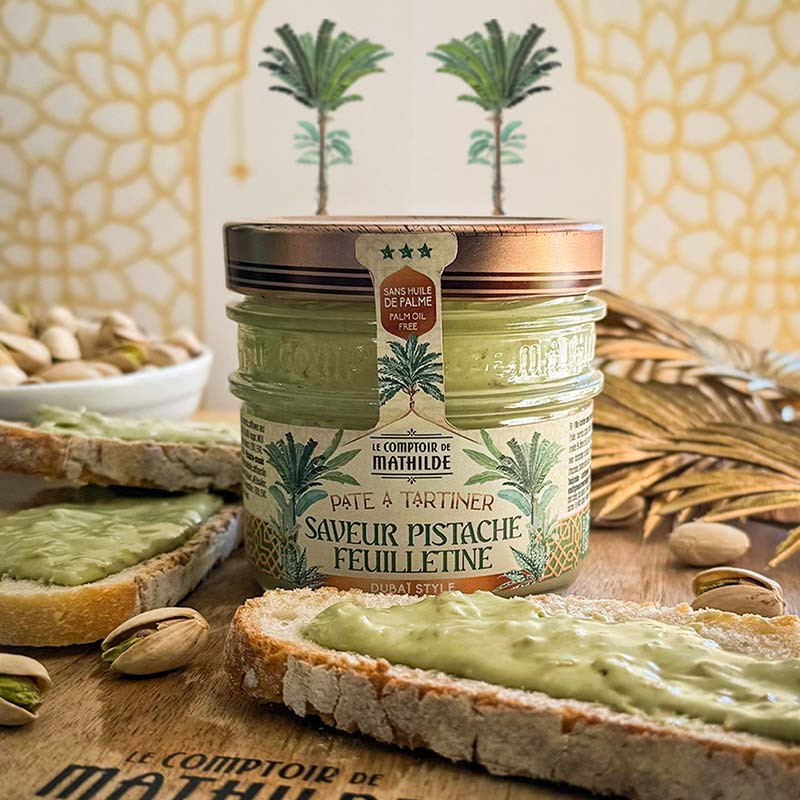 Désignation légale : Pâte à tartiner saveur pistache aux noisettes et biscuits finement émiettés