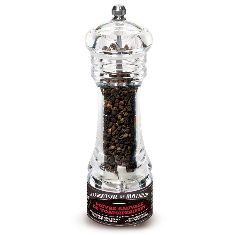 Mini Moulin transparent au design élégant pour habiller vos tables. Poivre aux notes boisées, résineuses, terreuses, d’agrumes, de fruits et de fleurs. Peut-être utilisé en assaisonnement pour les salades, sur les viande, les poissons blancs. Ce poivre est exceptionnel sur le foie gras, la pomme de terre et idéal avec les fromages blancs ou les fromages de chèvre.