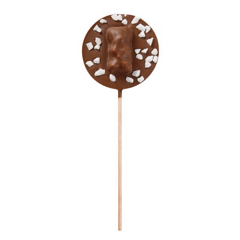 Cette sucette en chocolat au lait décorée d’un ourson en guimauve et de meringue vous ramènera le temps d’une gourmandise à vos souvenirs d’enfance.