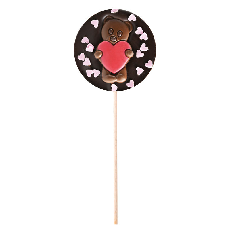 Déclarez votre amour avec gourmandise grâce à notre sucette en chocolat au lait avec un sujet ourson et ses petits cœurs en sucre.